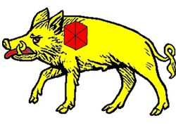 Blazon: (Fieldless) A boar passant Or charged on the shoulder with a hexagonal gemstone gules.