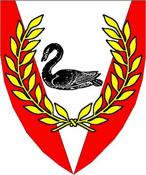 • Arms/Device - Gules, on a pile throughout argent a swan naiant sable within overall a laurel wreath Or