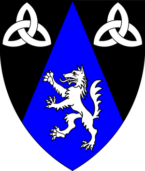 Per chevron throughout sable and azure, two triquetras and a wolf rampant argent. |