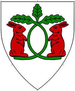 Argent, a doubly-slipped oak slip twined about itself vert between two rabbits sejant erect respectant gules shaded by the leaves and supported by the slips