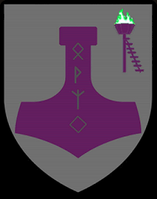 ![]() Argent, on a Thor's hammer purpure in pale the Elder Futhark runes Othala, Wunjo, Algiz, and Ingwaz argent, and for augmentation in sinister chief a beacon purpure enflamed vert. |