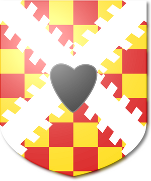 Checky gules and Or, a saltire raguly argent and overall a heart sable |