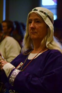 Mundanely, I hail from Kent, Ohio, where I have been a lifelong resident (except for my first two years which were spent in my birthplace of Berea, Ohio) and am a 1979 graduate of Kent State University (B.A., theatre, minor in anthropology). I am a retired paraprofessional outreach librarian, having worked for 30 years in the Akron-Summit County Public Library system (1983-2013). Outside of the SCA, I have multiple interests ranging from local and American history to genealogy to singing in a local town/gown choir and much more too numerous to mention! I enjoy hiking, water aerobics, swimming, and of course, archery. In 2012, I became involved in what ultimately became a successful effort to save a historic 1858 house that turned out to have been built by our town’s namesake Kent family. I was also partly responsible for helping to save a historic 1828 house in 2005 in Streetsboro, a community north of Kent. Someday, it’s my dream to write a local history book about research done on extant pre-Civil War homes still standing here in Kent, and a few that we sadly lost in recent years.
