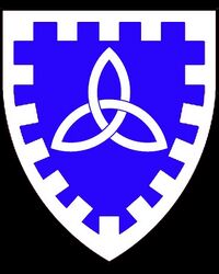 Azure, a triquetra within a bordure embattled argent |