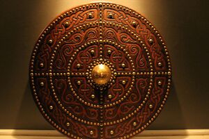 The targe was a round shield of roughly 18-21" diameter. It was was built with thin, early versions of plywood that were set with the grains running against each other for strength. This was then covered on the outside by cow hide and decorated with embossed Celtic designs.