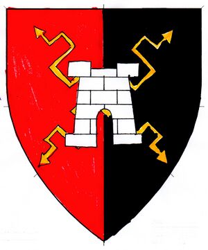 | devicecaption = Per pale gules and sable, two lightning bolts in saltire Or and overall a tower argent }} | | devicecaption = Per pale gules and sable, two lightning bolts in saltire Or and overall a tower argent }} | ||
