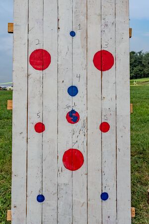 The target consists of a large set of boards, about 8x3 feet, that resembles the top of picnic table standing vertically. The board is white with 10 colored spots of various sizes and colors. Each circle is numbered and the center circle also has a large “S” or has “spear” written on it. Each competitor has their own target to throw at. The champions alternate throwing axes or knives until there have been 20 throws of each, retrieving between each round. In case of a tie, spears are used, and the champion who gets their spear closest to the circle marked “spear” wins.