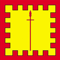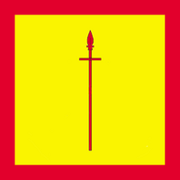 Blazon: Or, a boarspear within a bordure gules.