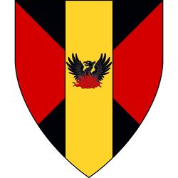 Per saltire sable and gules, on a pale Or a phoenix sable rising from flames gules. |